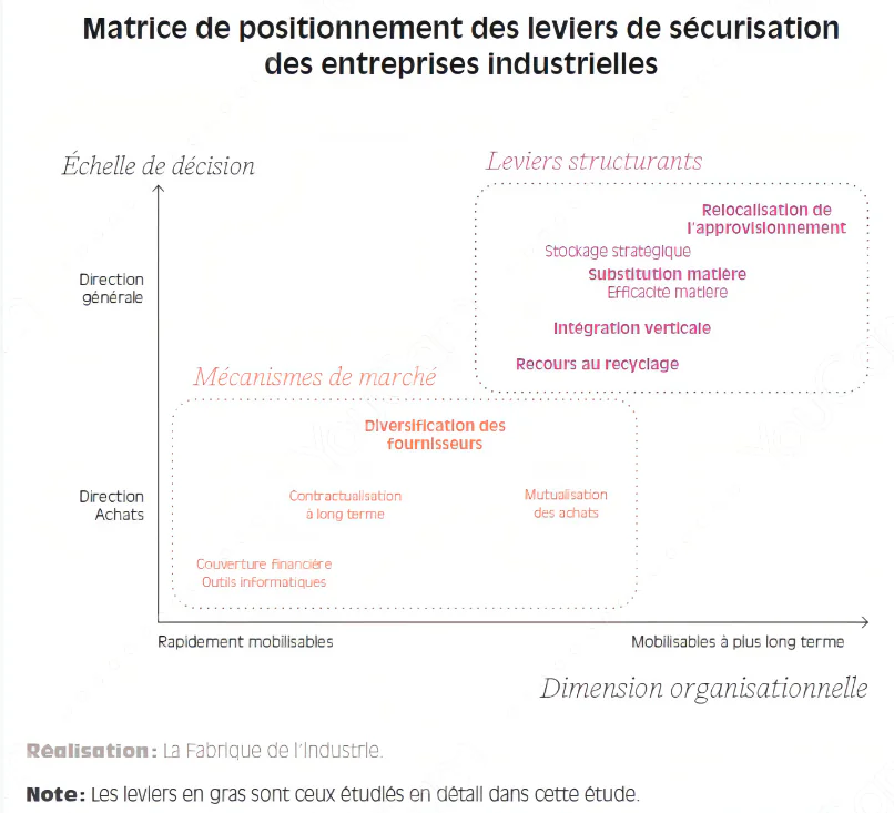 L’enquête met en lumière une prise de conscience accrue des risques d’approvisionnement chez les donneurs d’ordre industriels. Notre enquête de terrain montre une diversité de leviers à la portée des entreprises. La matrice suivante propose une représentation synthétique de leurs caractéristiques. Elle distingue, d’une part, les mécanismes de marché (notamment la diversification des fournisseurs) rapidement actionnables par les directions achats et, d’autre part, les leviers plus structurants (l’intégration verticale ou la substitution matière), nécessitant un engagement stratégique plus fort de la direction générale et des investissements de long terme. A titre d’illustration, au lendemain du déclenchement de la guerre en Ukraine, les groupes Airbus et Safran, acteurs majeurs de l’industrie aéronautique et de défense, ont réduit leur exposition au titane russe en diversifiant leurs sources d’approvisionnement et en rachetant leur fournisseur Aubert & Duval.