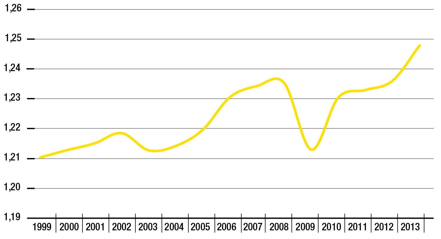 Figure 2 – Part de l’emploi exposé dans l’emploi total, 1999-2013