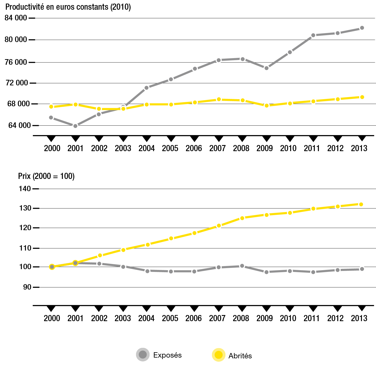 On observe ainsi que l’emploi exposé est minoritaire et en recul : il est passé en France de 30 % à 26,8 % de l’emploi total entre 1999 et 2013. Le secteur abrité est le véritable moteur de l’emploi : il progresse de 2,37 millions d’unités entre 1999 et 2013, alors que le secteur exposé perd 204 000 emplois. Néanmoins les gains de productivité sont supérieurs dans le secteur exposé. Les salaires y sont en moyenne 25 % plus élevés que dans le secteur abrité, et croissent plus rapidement, alors que les niveaux de qualification sont comparables.