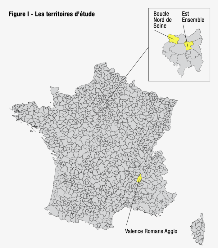 Notre recherche se focalise sur trois intercommunalités qui partagent une même préoccupation pour le foncier économique productif mais dont les enjeux économiques et territoriaux sont différents. Deux d’entre elles sont des territoires métropolitains situés en Île-de-France, Est Ensemble, en Seine-Saint-Denis, et Boucle Nord de Seine (BNS), à cheval sur les Hauts-de-Seine et le Val-d’Oise. Ces deux territoires ont le statut spécifique d’établissements publics territoriaux (EPT), à savoir des établissements publics de coopération intercommunale (EPCI) sans fiscalité propre, localisés dans le périmètre de la métropole du Grand Paris2. La troisième intercommunalité étudiée dans cet ouvrage, la communauté d’agglomération Valence Romans Agglo (VRA), est plutôt organisée autour de deux villes moyennes, Valence et Romans-sur-Isère.