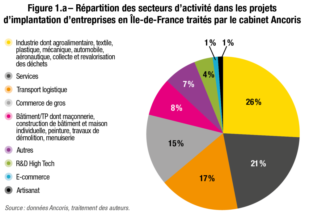 En Île-de-France, malgré la pression sur le foncier, la demande des entreprises industrielles représente plus d’un quart des demandes en foncier et immobilier selon l’échantillon des demandes traitées par le cabinet Ancoris sur la période courant du 1er janvier 2017 au 30 septembre 2021. Les principales activités représentées par ces projets relèvent en premier lieu de l’agroalimentaire, des industries métallurgiques et des matériaux de construction à égalité avec le recyclage et le réemploi.