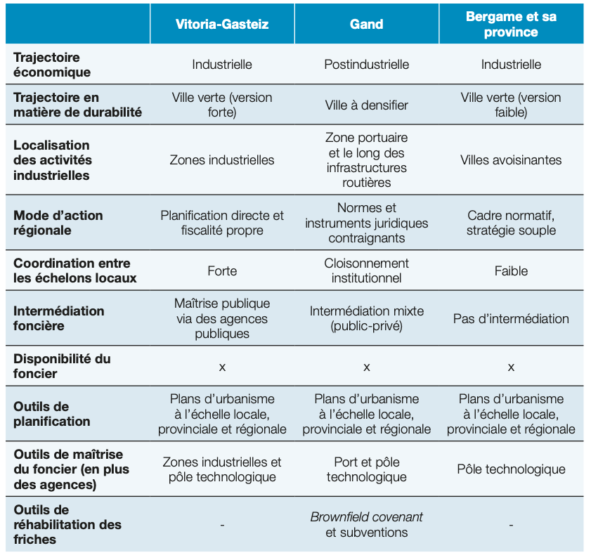 Si nous comparons ces modèles à celui ayant cours en France, nous observons que les outils mis en œuvre en matière de gestion du foncier sont assez similaires : des plans d’urbanisme pour définir les implantations futures, et l’aménagement de zones industrielles pour la maîtrise du foncier sur le temps présent. La France est dotée depuis 2010 de sociétés publiques locales pour soutenir l’aménagement territorial ; sur ce critère, le modèle basque dispose d’une très longue avance historique. Pensée dans les années 1970, une ceinture verte entoure Paris. Enfin, concernant la réhabilitation des friches industrielles, la France montre un certain volontarisme qui la distingue. D’un côté, elle vient de se doter d’un outil d’observation (Cartofriches, développé par le Cerema). De l’autre, elle a mis en place une politique des sites « clés en main », mettant l’accent sur la réhabilitation des friches pour un usage industriel. Ce type de politique apparaît novateur au regard des actions mises en place dans nos trois territoires d’étude.
