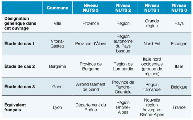 Ces études de cas appellent des descriptions et des commentaires à différents niveaux territoriaux, entre lesquels le lecteur doit naviguer. Les plus fréquemment mentionnés sont, par ordre d’échelle croissante, la ville, la province et la région. La comparaison de ces mailles territoriales entre quatre pays (en comptant la France) recèle de nombreuses ambiguïtés possibles, tant du fait d’homonymies ( e.g. la ville et la province de Bergame portent le même nom) que d’hétéronymies (ce que les Italiens et Espagnols nomment « province » correspond non pas aux provinces mais aux « arrondissements » belges, c’est-à-dire à peu près aux « départements » français). Par souci de clarté, nous parlerons dans cet ouvrage en termes génériques de « régions » et de « provinces », correspondant respectivement aux mailles NUTS 21 et NUTS 3 définies au niveau européen. En outre, sauf précision contraire, le terme Bergame désignera toujours par défaut la ville et non la province de Bergame (et ainsi de suite pour les autres territoires étudiés).