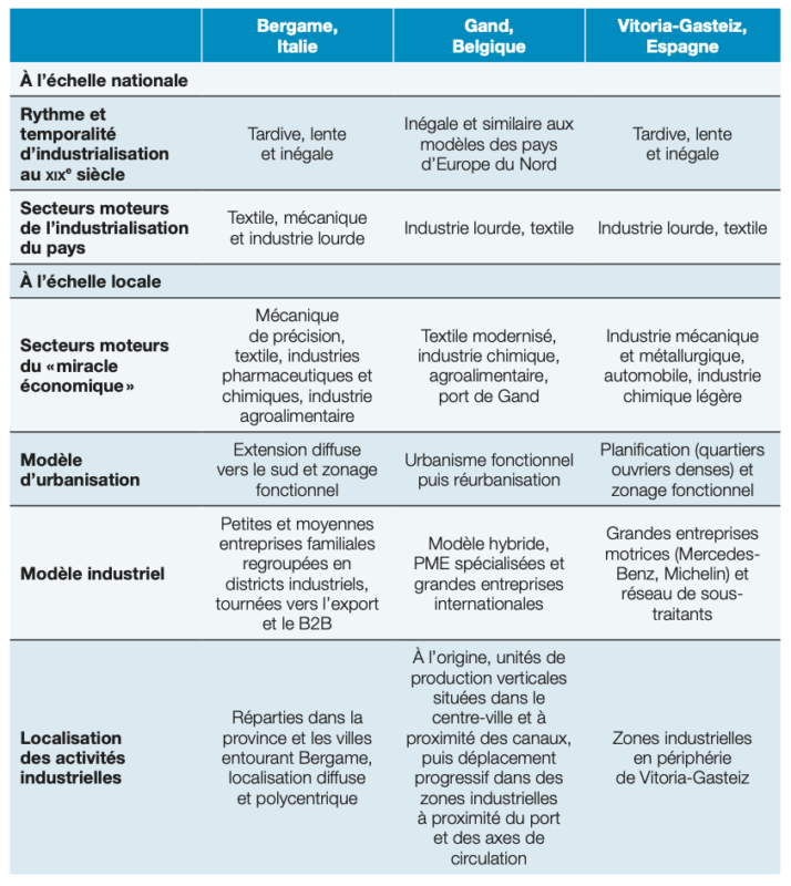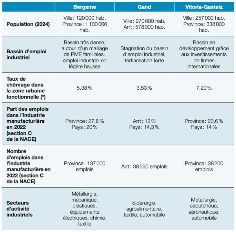 Les trois territoires étudiés dans cet ouvrage ont en commun d’avoir assis leur développement économique sur la présence d’activités métallurgiques et automobiles, dont les origines remontent au xixe siècle. Bergame et sa province, tout comme Vitoria-Gasteiz, ont maintenu une forte spécialisation dans l’industrie : en 2022, celle-ci représentait 27,8 % de l’emploi total dans la province de Bergame et 23,6 % dans la province d’Álava, contre 21 % et 20 % respectivement à l’échelle nationale, selon Eurostat. L’arrondissement de Gand, pour sa part, suit une trajectoire économique que l’on peut qualifier de « postindustrielle », tout comme le reste de la Belgique : l’industrie y représente désormais 12 % de l’emploi (13,5 % pour la Belgique).
