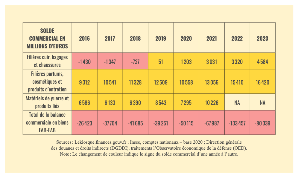 Avec une part moyenne de 9 % dans les échanges mondiaux d’armement entre 2015 et 2024, la France est devenue le deuxième pays exportateur en 2024. Sur la période 2012-2021, son solde commercial en matériel de guerre a été quasiment multiplié par deux. Quant au secteur du luxe, la part des ventes françaises parmi les cent premières entreprises a augmenté entre 2013 et 2022 de neuf points de pourcentage. La France constitue le premier exportateur mondial dans la parfumerie cosmétique tandis que le solde commercial de la filière du cuir est devenu positif en 2019. Ces deux secteurs sont évidemment très différents. Pour autant, nous pouvons expliquer une partie de leurs performances à l’export par des stratégies communes aux deux secteurs. Des exemples à suivre ?