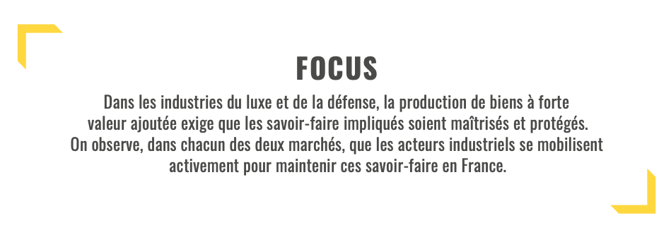 Or on observe, dans chacun des deux marchés, que les acteurs industriels se mobilisent activement pour maintenir ces savoir-faire en France. Les acteurs du luxe, s’appuyant sur le patrimoine français pour justifier leur positionnement, ont parfois ancré les savoir-faire dans des territoires spécifiques. En témoigne l’inscription au patrimoine culturel immatériel de l’Unesco en 2018 de la ville de Grasse, où sont cultivées les essences de parfums, ou encore les règles d’attribution du label « haute couture » qui contraint depuis 1945 la fabrication des pièces au sein des ateliers parisiens. Dans le secteur de la défense, le maintien des capacités industrielles sur le territoire est avant tout une question d’autonomie stratégique1. Pour cette raison, les maîtres d’œuvre industriels2 (MOI) et la Direction générale de l’armement (DGA) cherchent à préserver au maximum l’activité sur le sol national, en alternant commande nationale et contrats à l’exportation pour éviter que des interruptions dans la production n’induisent une perte de compétences qui affaiblirait l’autonomie des forces armées françaises.