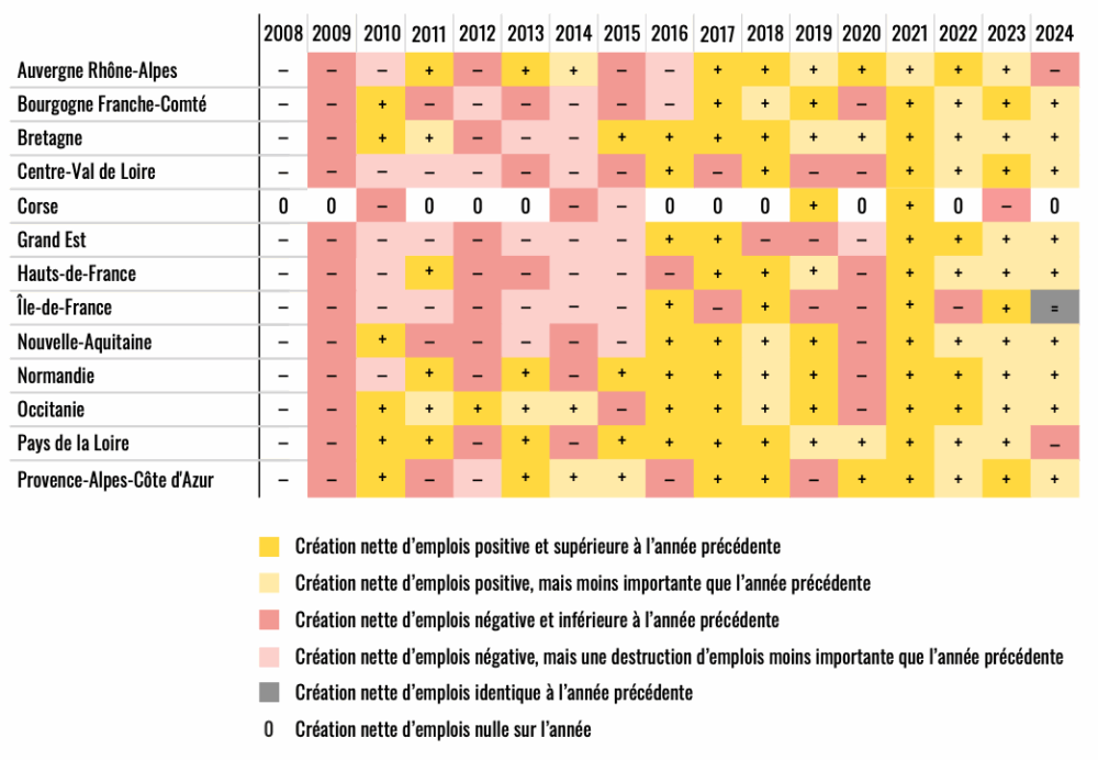 De même, tous les territoires n’ont pas suivi exactement la même tendance. Si les Pays de la Loire, la Bretagne ou encore l’Occitanie ont assez rapidement repris un rythme positif de créations d’emplois industriels, l’Île-deFrance ou le Centre-Val de Loire peinent à présenter un solde net de création d’emplois positif sur toute la période 2008-2024. Ces différences s’expliquent en partie par des déterminants macroéconomiques (productivité dans l’industrie, évolution de la demande), par la spécialisation sectorielle du territoire, et par des conditions qui lui sont propres, telles que le prix du foncier, la disponibilité de la main-d’œuvre ou encore la qualité de la gouvernance (Carré et al, 2019).