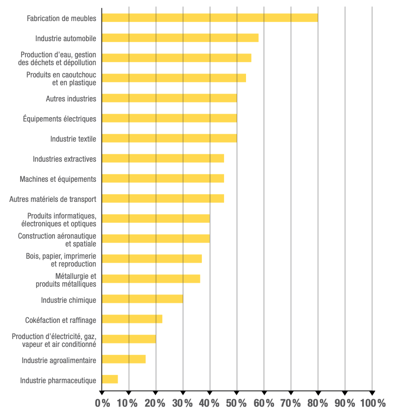 À l’opposé, un quart des entreprises ont tout de même vu leur chiffre d’affaires augmenter en 2020 par rapport à l’année précédente. L’industrie pharmaceutique se démarque par ses bonnes performances : 54 % des entreprises ont augmenté leur chiffre d’affaires. Dans l’industrie agroalimentaire, près de 40 % des entreprises en témoignent également.