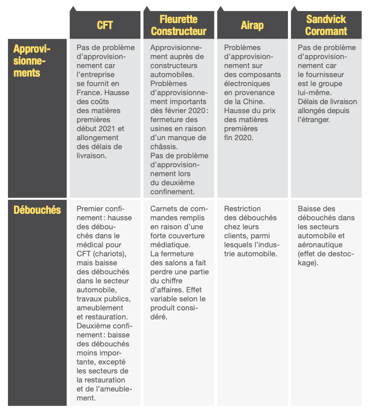 Selon une enquête du Conseil national des achats (CNA) réalisée en mai 2020, 65 % des entreprises interrogées dans les secteurs de l’aéronautique et de la défense craignaient la faillite de leurs fournisseurs stratégiques. Un sous-traitant aéronautique a ainsi été contraint de trouver un autre fournisseur pour se prémunir de la faillite d’une PME rouennaise qui les fournissait en mécanique et qui « battait déjà de l’aile avant la crise », comme en témoigne un cadre d’une entreprise interrogée.
