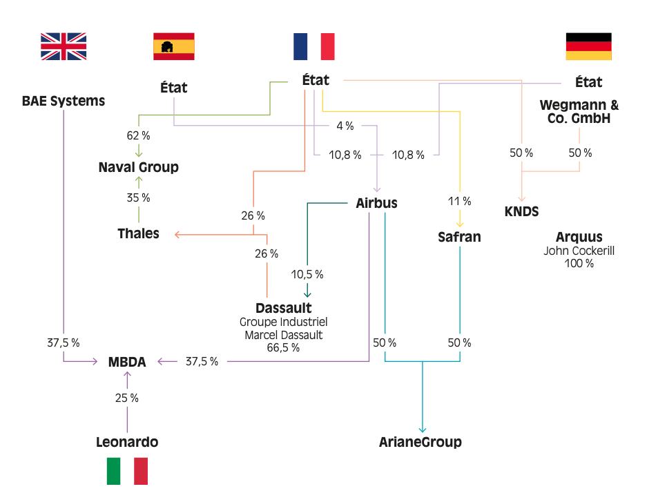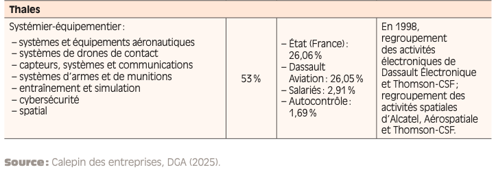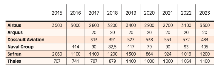 • 3 — Cet ensemble comprend : Airbus Defence & Space, Thales, Safran, MBDA, Naval Group, Dassault Aviation, ArianeGroup, Nexter, Arquus. On peut également inclure le CEA, un établissement public de recherche à caractère industriel et commercial.