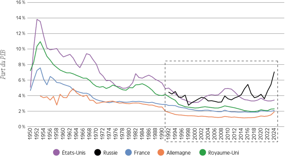 Enfin et surtout, ces efforts budgétaires et commandes d’armement s’inscrivent dans un contexte international marqué par des tensions plus ou moins affirmées. C’est ce qui explique, d’abord, qu’ils aient considérablement diminué depuis le début des années 1990, tant en France et en Europe qu’aux États-Unis. Cette réduction s’explique avant tout par la fin de la guerre froide et la période des « dividendes de la paix » qui a suivi. En 1953, les dépenses militaires de la France représentaient en effet 7,5 % de son PIB, tandis que les États-Unis ont atteint en 1952 un niveau de 14 %. Ces proportions ont au contraire atteint un minimum historique de 1,85 % en 2013 et de 3 % en 1999, respectivement.