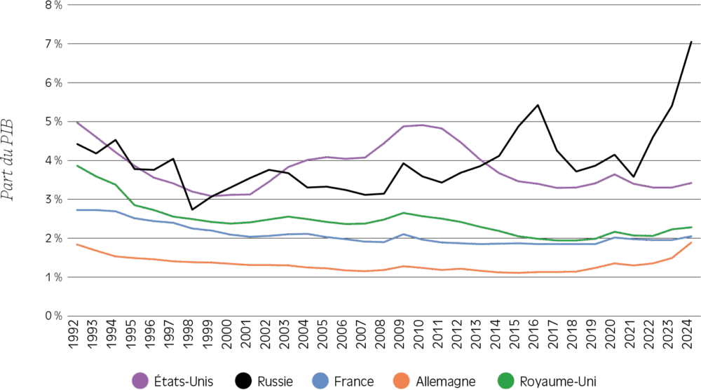 Outre les ambitions géopolitiques propres à la France, ses dépenses militaires sont également déterminées par ses engagements internationaux dans le cadre de l’Otan. Depuis 2006, elle devait ainsi atteindre un niveau de dépense équivalant à 2 % de son PIB, effort collectif considéré comme minimal pour affermir la crédibilité de l’alliance. Désormais, selon les termes du sommet des 24 et 25 juin 2025 à La Haye, la cible a été portée à 3,5 % du PIB d’ici à 2035 – à quoi il faut encore ajouter 1,5 % afin de renforcer la protection des frontières et la cybersécurité. En 2023, les dépenses militaires du Canada et des pays européens appartenant à l’Otan atteignaient seulement 1,78 % de leur PIB12.