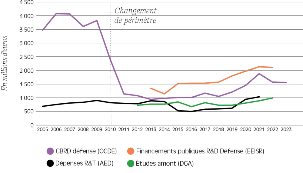 L’évolution des dépenses publiques de R&D de défense n’est pas évidente à suivre à partir des années 2010. En effet, d’après les chiffres de l’OCDE, les CBRD de défense enregistrent une chute brutale en France, passant de 4 à 1 milliard d’euros, sans justification apparente dans les sources officielles (fig. 3.4). Cette discontinuité suggère un artefact statistique, probablement lié à une modification du périmètre comptable utilisé par l’OCDE. En tout état de cause, les montants recensés jusqu’en 2010 correspondent au périmètre de la « R&D », au sens que lui donnent la DGA et le ministère des Armées, quand les montants disponibles après cette date sont nettement plus proches du volume de la R&T (fig. a, b et c).