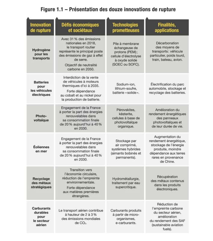 Partant, la première étape a consisté à identifier, sur la base de documents stratégiques12 et d’auditions d’experts, un échantillon d’innovations de rupture qui présentaient de forts enjeux à la fois sociétaux et technologiques. Dans le secteur industriel, il existe une myriade de solutions qui répondent à ces deux critères et dont le caractère disruptif est déjà bien documenté, sinon avéré. Cette étude se concentre volontairement sur douze innovations de rupture, dont huit sont directement liées à la préservation de l’environnement et à la transition énergétique. En matière de transition bas carbone, certaines ont un caractère disruptif – puisqu’elles offrent un tout nouveau service – bien qu’elles ne s’appuient pas sur des technologies de pointe mais plutôt sur l’assemblage ou l’optimisation de technologies existantes. Par exemple, le développement de l’hydrogène vert dépend largement de l’optimisation de l’électrolyse, même s’il constitue une rupture dans les secteurs de l’énergie et de la mobilité, et qu’il mérite pour cette raison d’être suivi avec attention.