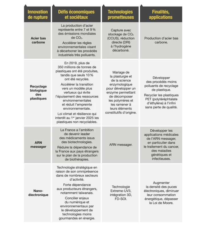 Partant de cette définition, nous identifions douze innovations de rupture, toutes mentionnées dans des rapports d’experts de haut niveau, et dont huit sont directement liées à la préservation de l’environnement et à la lutte contre le dérèglement climatique. Dans le secteur industriel, il existe en effet une myriade de solutions aux problèmes posés par la transition énergétique, parmi lesquelles figurent notamment l’hydrogène décarboné, les batteries pour véhicules électriques ou encore l’acier bas carbone.