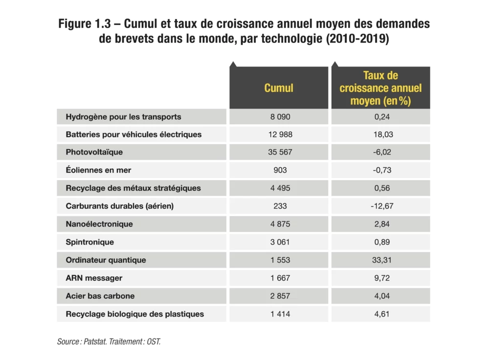 L’ouvrage examine la position des acteurs mondiaux et des pays correspondants vis-à-vis de douze technologies clés, dites de rupture, à partir des dépôts de brevet, ce qui est une approche originale et très pertinente. Après avoir cerné le caractère disruptif, soit technologique, soit lié aux usages et au marché, l’étude se focalise à juste titre sur le seul secteur industriel, vecteur de déploiement de ces technologies dans la société.