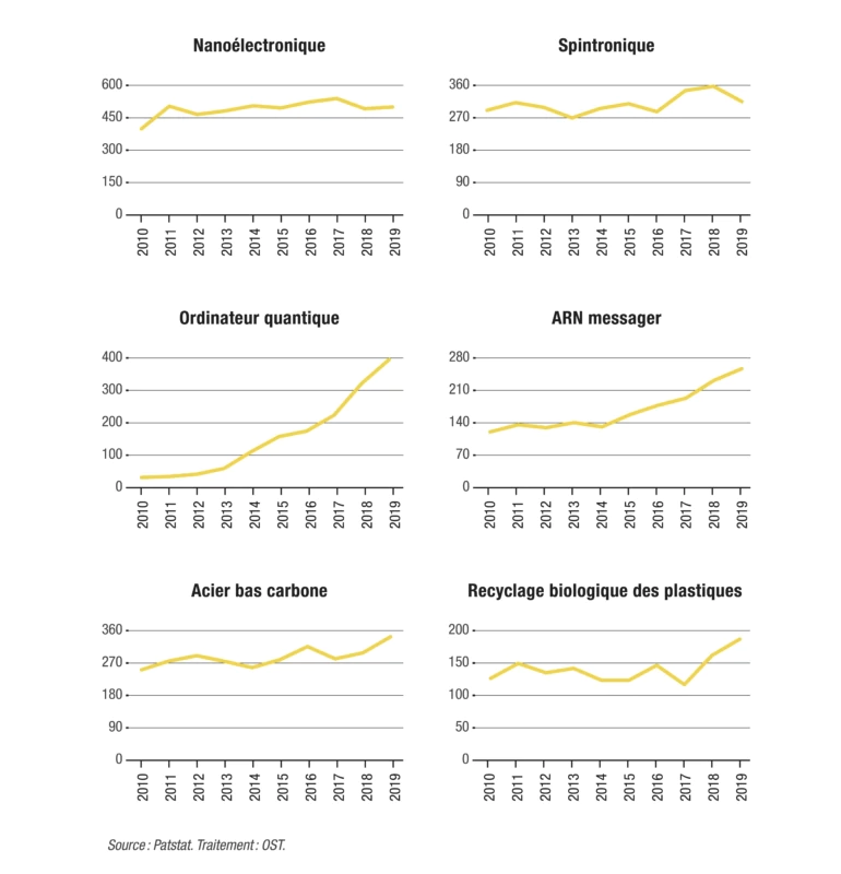 Il est encore plus frappant de constater que ce sont souvent les mêmes pays qui occupent les premières places du podium. Dans trois cas, plus de la moitié des brevets mondiaux sont détenus par un déposant américain, conférant aux États-Unis une très large avance sur tous les autres pays : il s’agit des agrocarburants pour l’aviation, de l’ordinateur quantique et de l’ARN messager. Dans ces deux derniers cas, la domination américaine est d’autant plus frappante qu’elle concerne des secteurs en très forte expansion (au sens où le nombre de brevets déposés croît très vite d’une année sur l’autre).