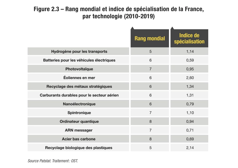 Une analyse fort pertinente est celle relative au degré de spécialisation des différents pays ; autant on peut comprendre que de très grands pays comme les États-Unis et la Chine sont présents dans tous les segments, autant on peut être surpris de voir la France, puissance moyenne, comme étant peu spécialisée, contrairement à la Corée ou au Japon, qui trouvent là une clef de leur performance. Sans doute retrouve-t-on ici l’héritage historique d’une France gaullienne ne voulant dépendre de personne, mais s’essoufflant aujourd’hui dans un contexte de mondialisation et de multiplication des technologies : on ne peut plus ambitionner d’être bon partout. Une dépendance européenne étant aujourd’hui bien plus acceptable, une stratégie optimale, quoiqu’un peu simplificatrice, serait d’ambitionner pour notre continent un positionnement de premier plan dans tous les secteurs, s’appuyant sur une spécialisation par pays, faisant du nôtre un leader dans un nombre suffisant de segments.