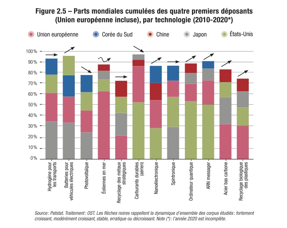 Lorsqu’on raisonne à l’échelle de l’Union européenne, on obtient des résultats plus encourageants : dans la quasi-intégralité des domaines technologiques étudiés, le rang mondial de l’Union européenne varie entre la première et la deuxième place du podium. Elle se distingue particulièrement dans le domaine des éoliennes en mer avec près des deux tiers des brevets déposés au cours de la décennie étudiée. Dans les autres domaines, l’Union européenne ne détient jamais plus de la moitié des brevets, contrairement aux États-Unis qui conservent une large avance dans les domaines de l’ordinateur quantique et de l’ARN messager. Il convient, par ailleurs, de souligner que le leadership de l’Union européenne tient essentiellement à celui de quelques pays, dont l’Allemagne qui tient le haut du pavé. La France ne joue pas de rôle significatif en la matière. En outre, on rappelle que la Corée ou le Japon peuvent parfois faire jeu égal à l’Union européenne toute entière.
