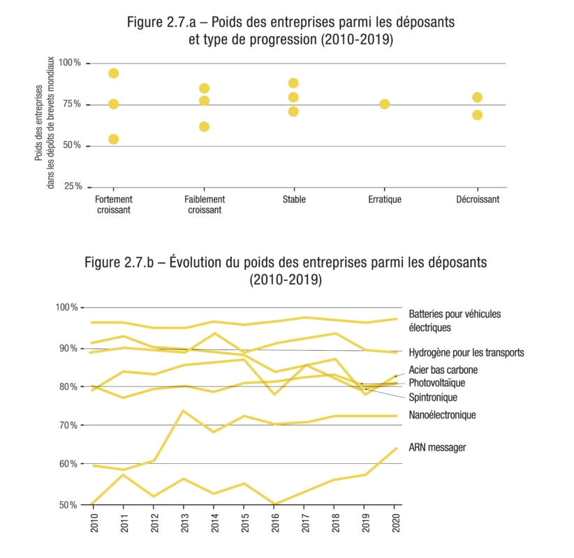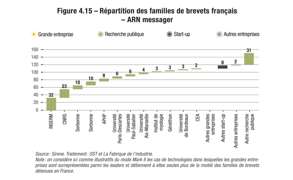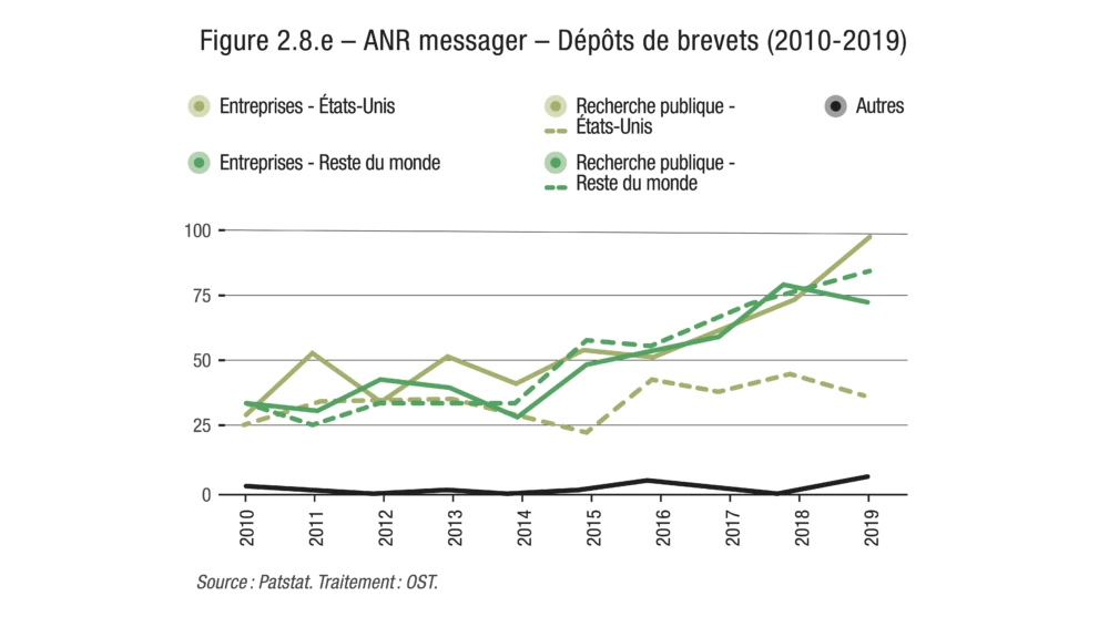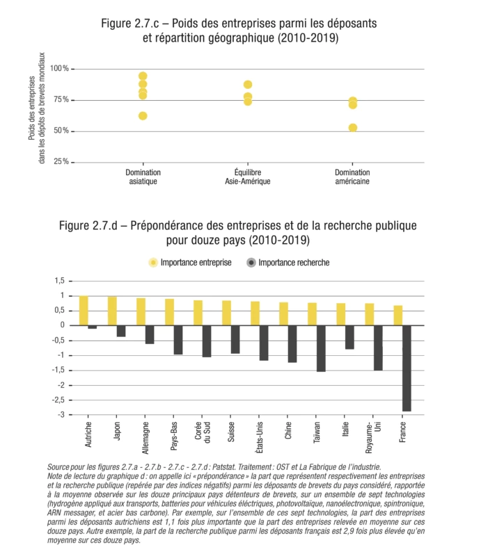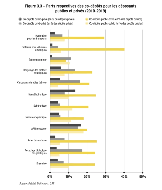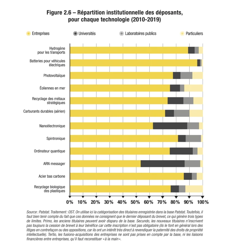 L’ouvrage étudie aussi les apports respectifs des acteurs publics et privés. Chaque année, la grande majorité des brevets relatifs aux innovations de rupture sont déposés par des entreprises. La recherche publique occupe très souvent une place modeste, où qu’elle soit dans le monde. Les cas les plus emblématiques de cette domination quasi exclusive des entreprises sont les batteries pour véhicules électriques et l’hydrogène décarboné : elles sont à l’origine de plus de 90 % des dépôts de brevets tout au long de la période étudiée, entre 2010 et 2019. À l’inverse, la recherche publique fait parfois figure de pionnière, à l’instar du domaine de l’ARN messager, où elle était à l’origine de la moitié des dépôts de brevets en 2010, pour n’en représenter plus qu’un tiers en 2019. Il est par ailleurs intéressant de noter que la recherche publique est relativement plus représentée parmi les déposants américains, chinois et, bien plus encore, parmi les déposants français.