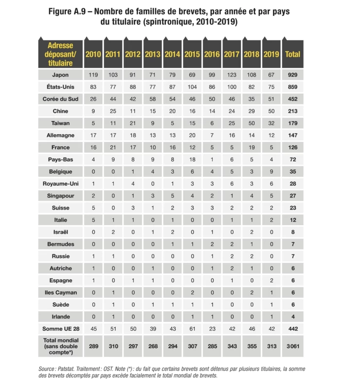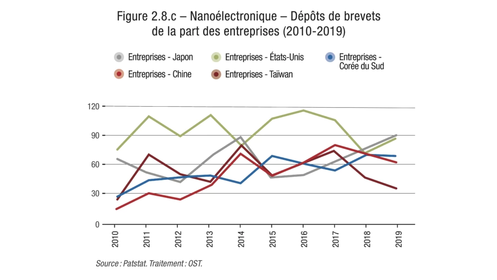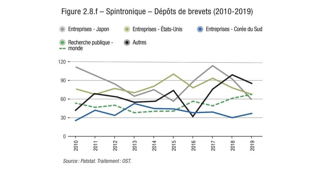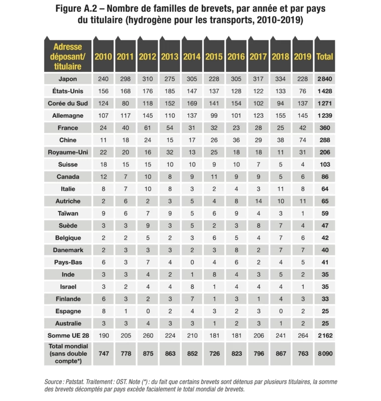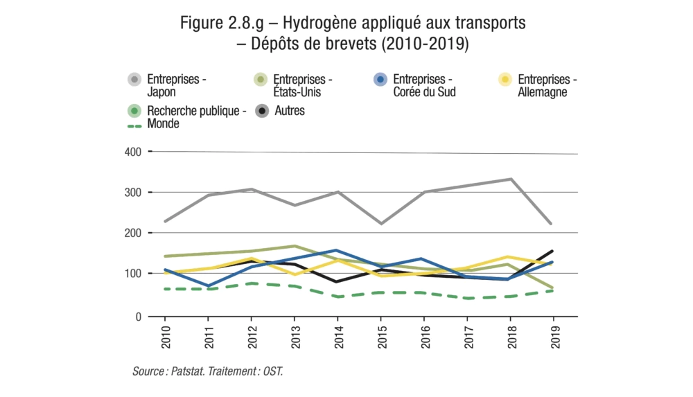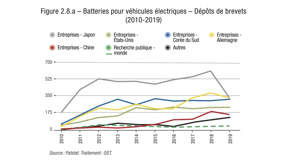 Pour quatre autres technologies, ce sont au contraire des déposants localisés en Asie, et plus précisément au Japon, en Corée et en Chine (ces trois pays étant de toute façon omniprésents sur 11 des 12 podiums), qui détiennent au moins la moitié des brevets mondiaux déposés dans la décennie étudiée : il s’agit de l’hydrogène pour les transports, des batteries pour véhicules électriques, du photovoltaïque et de la spintronique. À un point de pourcentage près, on pourrait également le dire de la nanoélectronique.
