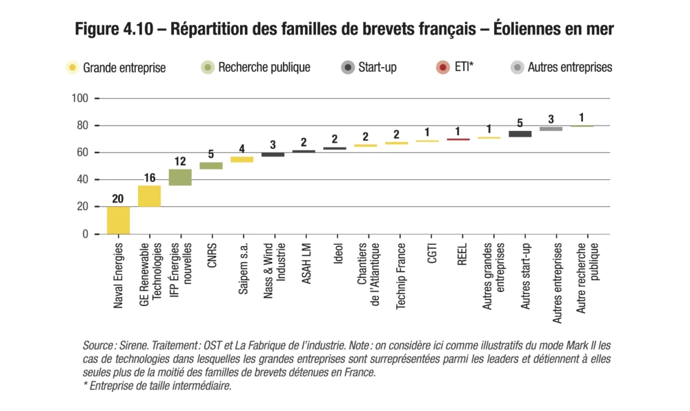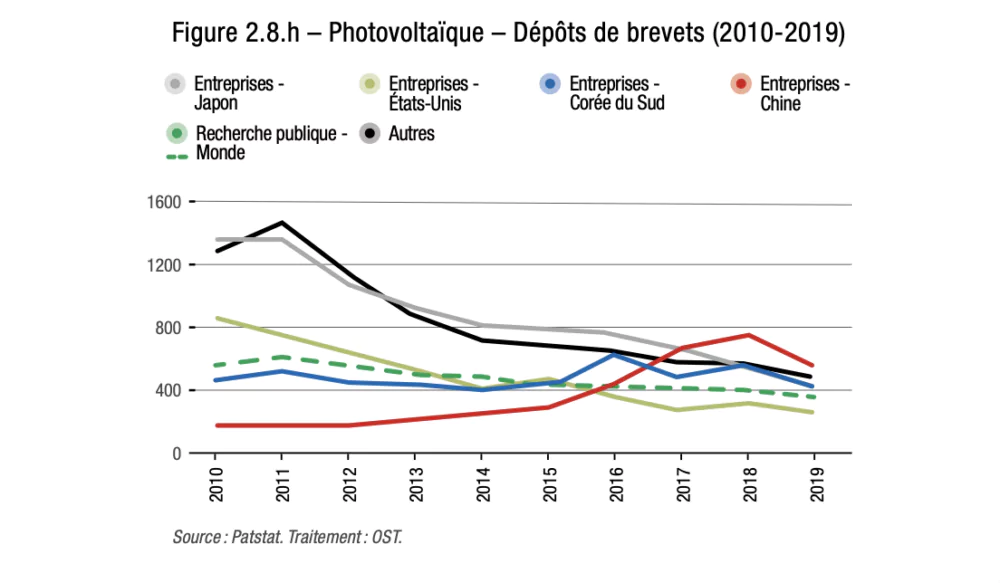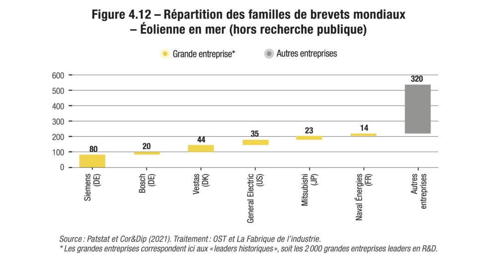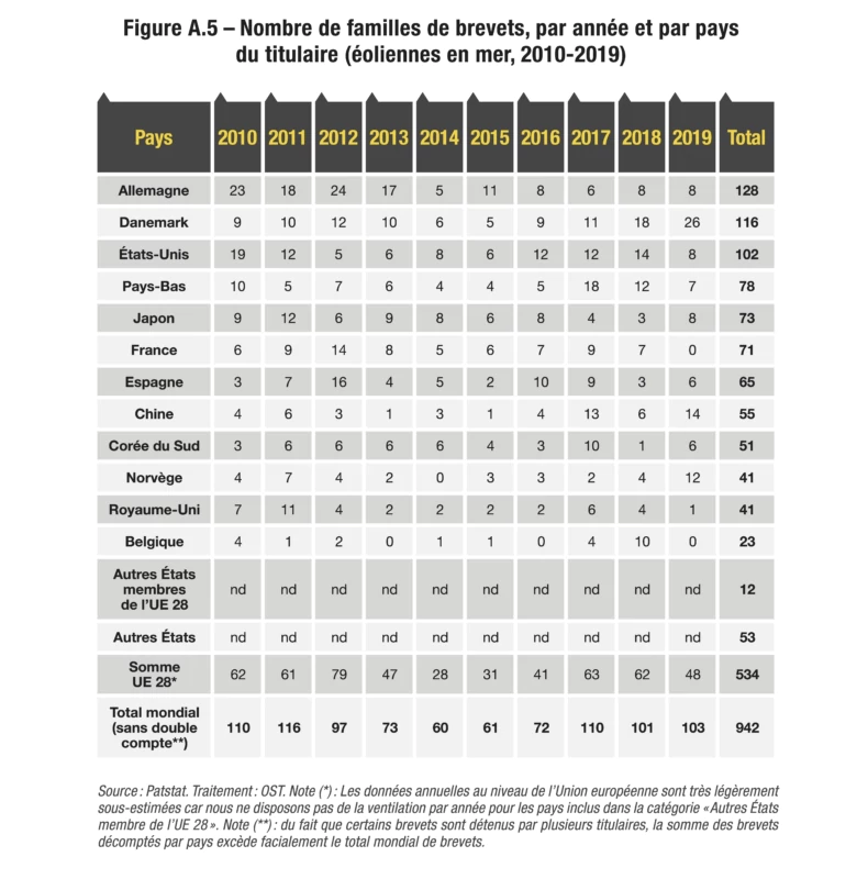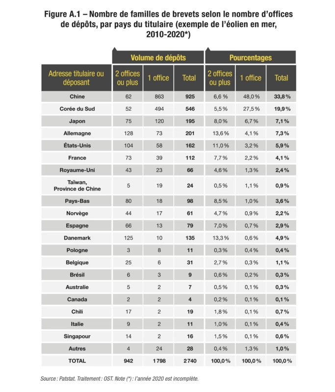 En effet, selon que les familles de brevets ont été déposées auprès d’un seul office ou au moins deux, la hiérarchie des titulaires change. Dans le premier cas, les pays asiatiques, au premier rang desquels figure la Chine, sont surreprésentés : les adresses chinoises, coréennes et japonaises représentent plus de 82 % des demandes mondiales de dépôts de brevets dans le domaine. Les adresses chinoises représentent à elles seules 48 % des demandes. Dans le second cas, ce sont les Allemands, les Danois et les Américains qui apparaissent comme leaders technologiques du domaine.
