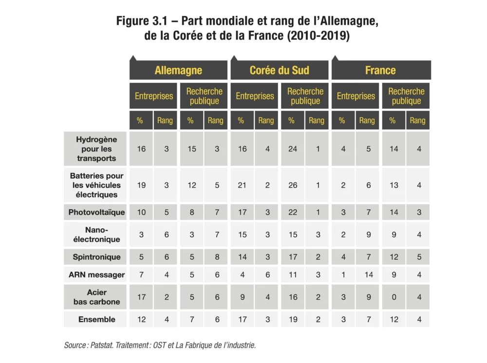 La France, contrairement aux États-Unis, Chine, Japon Corée et Allemagne, n’apparaît jamais parmi les quatre premiers pays dans chacun des douze segments étudiés. Notre pays occupe les rangs 5 à 9, avec une concentration autour de 6 ou 7.