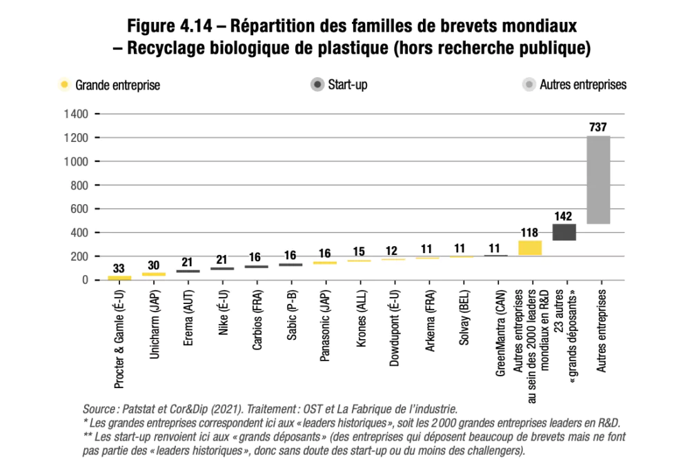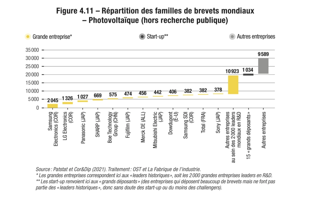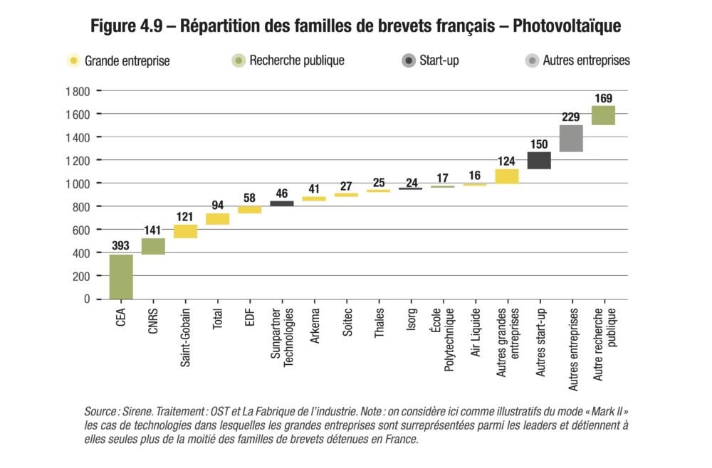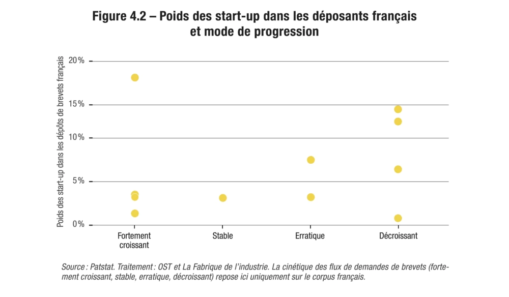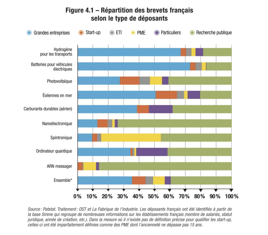 Alors qu’on a beaucoup écrit sur l’incapacité de la France à faire émerger des start-up innovantes, l’idée d’un rôle décisif qu’elles joueraient dans l’émergence des innovations de rupture est battue en brèche par les données : elles figurent rarement parmi les principaux déposants de brevets. Bien sûr, les start-up se distinguent dans certains domaines, parmi lesquels le photovoltaïque, le recyclage biologique de plastique ou l’ARN messager. Leur réussite est d’ailleurs souvent le fruit d’une fructueuse collaboration avec la recherche publique, dont elles sont même parfois directement issues.