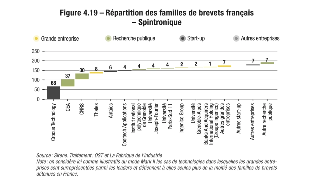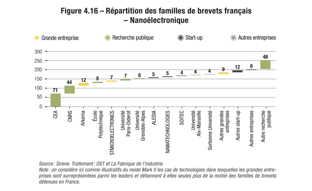 Afin de caractériser les déposants de familles de brevets (entreprises, administration publique, universités, individus), l’OST s’est appuyé sur la typologie issue de la base de données Patstat. Toutefois, les données publiées par celle-ci ne consignent que le dernier déposant du brevet. Ainsi l’exploitation des données présente trois limites principales. Premièrement, les titulaires originels du brevet peuvent avoir disparu de la base. Deuxièmement, les nouveaux titulaires n’inscrivent pas toujours le rachat de brevet car cette inscription n’est pas obligatoire (elle est généralement effectuée lors de litiges en contrefaçon)36.