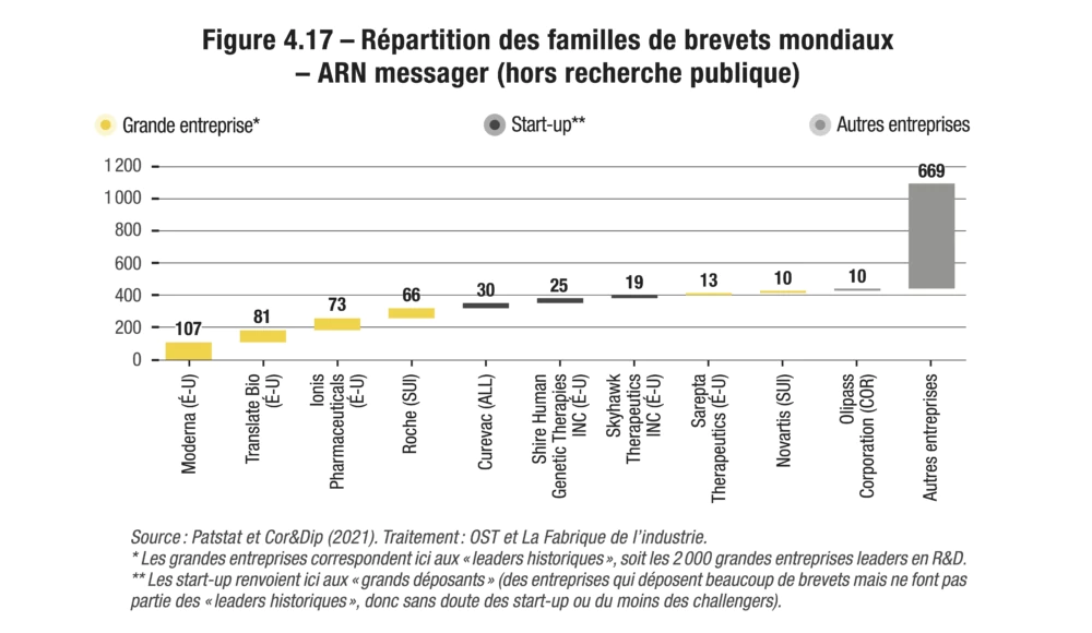 Cet ouvrage porte, pour finir, un regard sur les rôles respectifs des start-up et des grandes entreprises dans l’avènement des innovations de rupture. Depuis que la planète entière s’en est remise aux vaccins à ARN messager, il n’est en effet plus un seul secteur d’activité qui ne redoute de se faire tôt ou tard « désintermédier » par des start-up triomphantes. L’analyse bibliométrique montre en réalité que, d’un domaine technologique à l’autre, la dynamique d’innovation n’obéit pas aux mêmes schémas, et qu’elle ne se résume pas à une alternative entre les archétypes schumpétériens « Mark I » (dans lequel les innovations de rupture sont apportées par des nouveaux entrants de petite taille acceptant de prendre de gros risques) et « Mark II » (dans lequel les entreprises historiques maintiennent leur avance technologique en capitalisant sur leurs connaissances antérieures). En France, comme à l’international, les start-up comptent rarement parmi les principaux déposants de brevets sur les douze domaines ici étudiés. Certes, elles peuvent se distinguer dans certains domaines. Mais cela reste une situation assez minoritaire, qui ne s’observe d’ailleurs qu’aux États-Unis, en Chine et – bien plus modestement – en France, mais jamais en Corée, au Japon ni en Allemagne. Les grandes entreprises figurent donc très souvent comme les pourvoyeuses leaders d’innovations de rupture, dans tous les domaines et dans tous les pays… sauf en France.