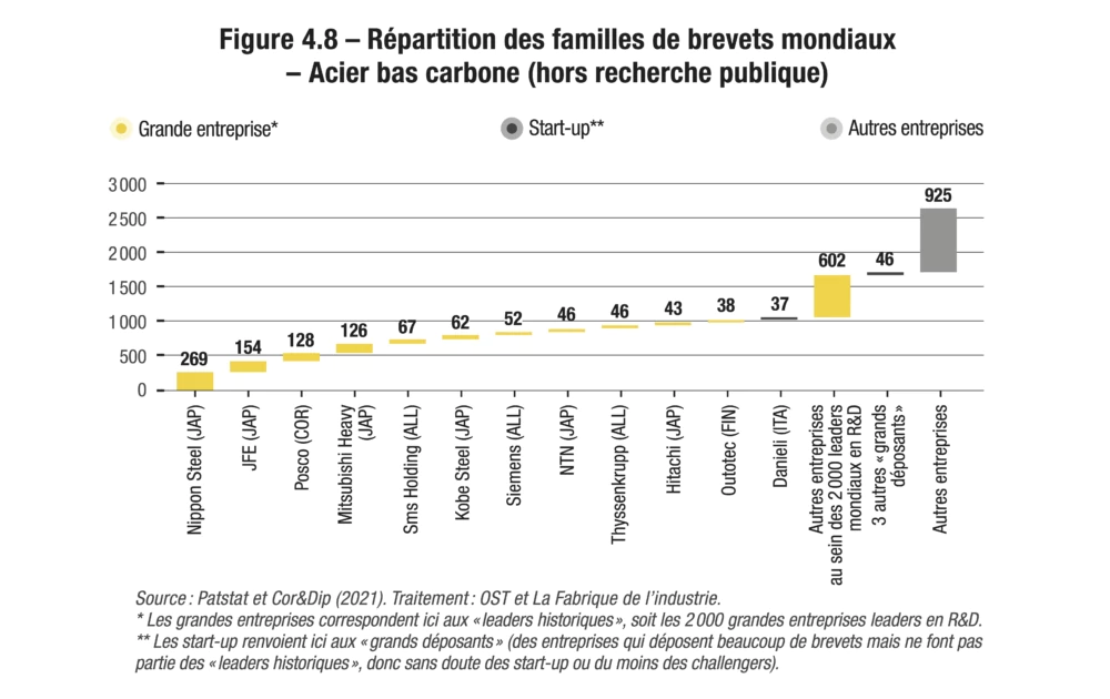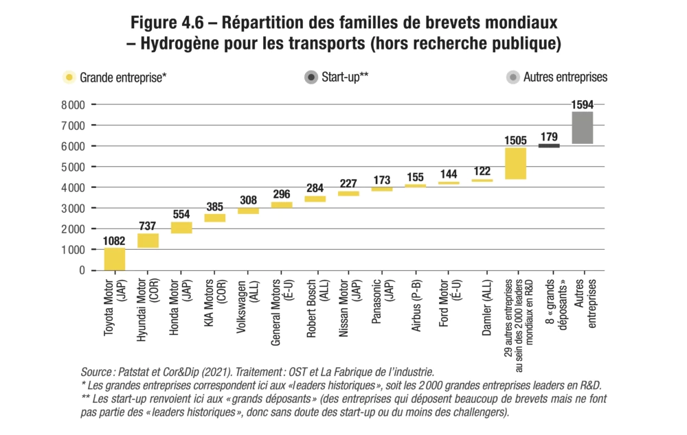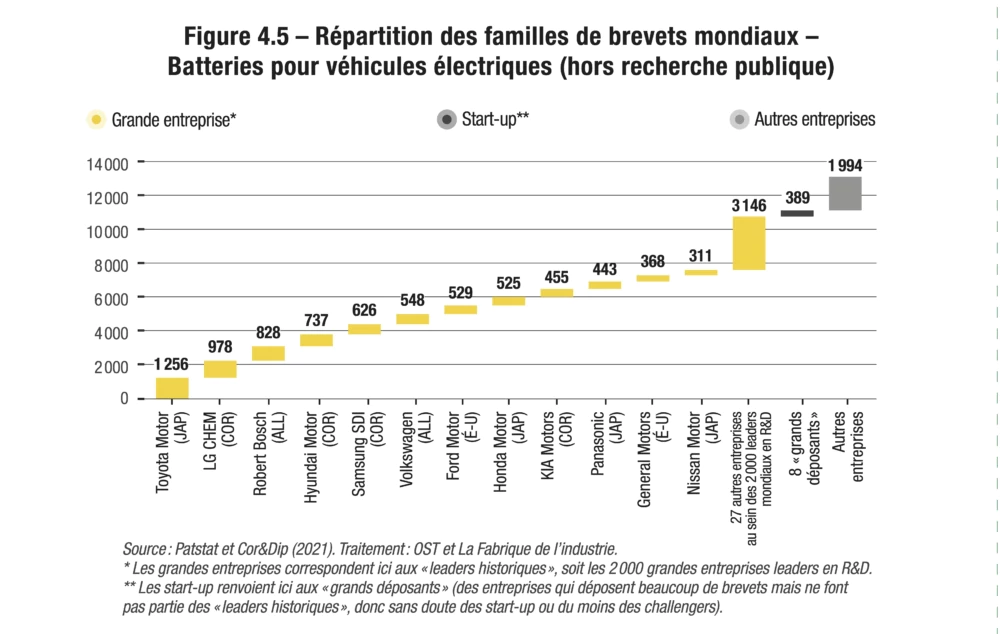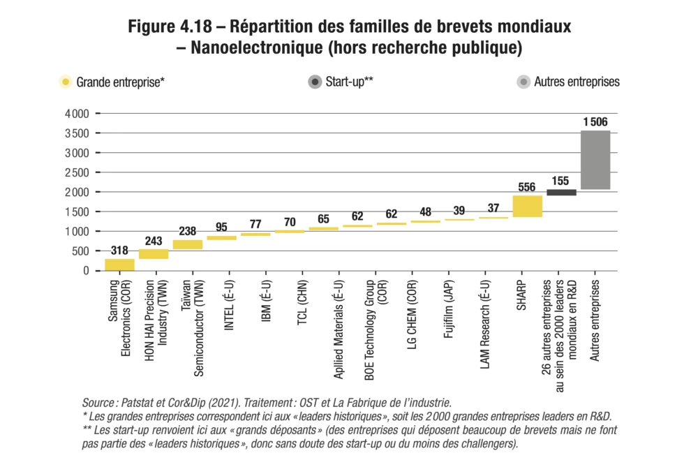 Afin d’identifier l’activité des grands groupes dans le cadre de chacune des douze technologies étudiées, l’OST a, dans un premier temps, additionné les familles déposées par chaque maison mère et ses filiales. Il est possible qu’un certain nombre de fusions et acquisitions, non rendues publiques, échappent à cette comptabilisation. Les grands groupes ainsi détectés ont ensuite été confrontés à la base Cor&Dip (2021), qui fournit des informations sur l’activité de R&D, les brevets et les marques des 2 000 entreprises les plus performantes en R&D dans le monde.