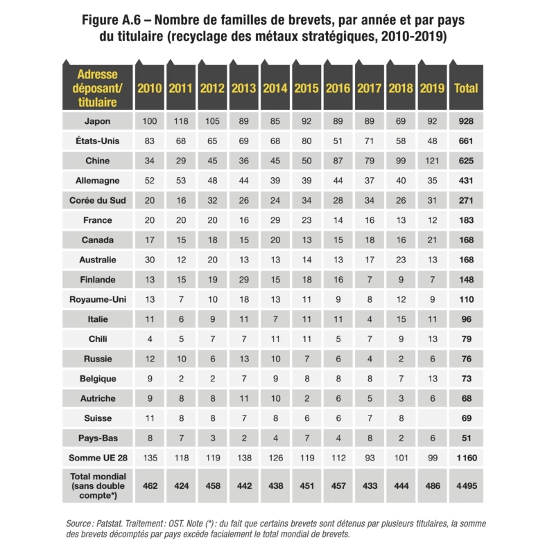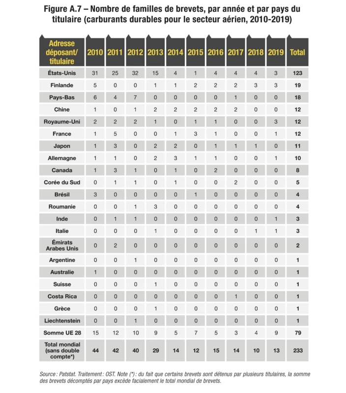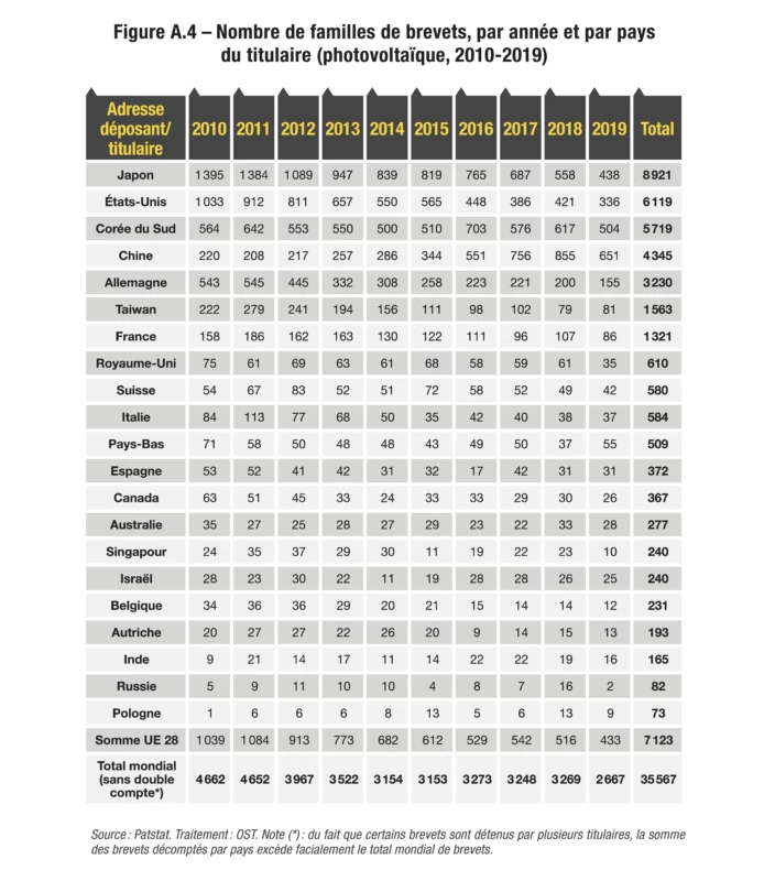 Pour ce faire, l’Observatoire des sciences et techniques (OST) s’est appuyé sur Patstat, une base de données produite par l’Office européen des brevets (OEB, ou EPO pour European Patent Office), qui contient des données exhaustives de dépôts de brevets réalisés auprès des principaux offices nationaux et de deux grands offices régionaux, l’Office européen des brevets et l’Organisation mondiale de la propriété intellectuelle (OMPI, ou WIPO pour World Intellectual Property Organization). Outre son large périmètre géographique, l’intérêt de la base Patstat réside dans le regroupement des brevets en familles, qui rassemblent les brevets déposés par un même déposant autour d’une même technologie ou invention. Il est en effet fréquent que des dépôts de brevets soient réalisés dans plusieurs pays pour une seule invention. De même, il arrive qu’un premier dépôt de brevet, dit brevet prioritaire, soit complété par des extensions. La comptabilisation des familles de brevets35 plutôt que des brevets isolés permet ainsi d’éviter les duplications.