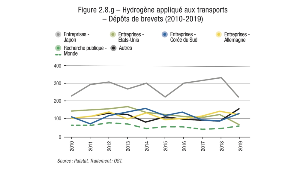 Pour quatre autres technologies, ce sont au contraire des déposants localisés en Asie, et plus précisément au Japon, en Corée et en Chine (ces trois pays étant de toute façon omniprésents sur 11 des 12 podiums), qui détiennent au moins la moitié des brevets mondiaux déposés dans la décennie étudiée : il s’agit de l’hydrogène pour les transports, des batteries pour véhicules électriques, du photovoltaïque et de la spintronique. À un point de pourcentage près, on pourrait également le dire de la nanoélectronique.