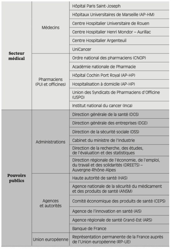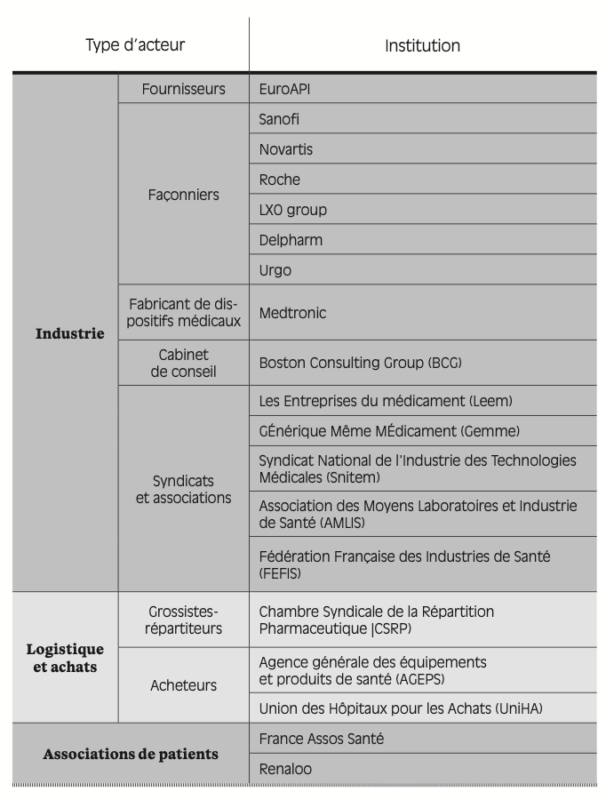 Enfin, plus généralement, nous tenons à remercier l’ensemble des personnes rencontrées dans le cadre de ce travail : industriels, représentants d’administration, médecins, pharmaciens, syndicats ou encore associations de patients. Les échanges ont tous été enrichissants, et nous avons grandement apprécié la transparence avec laquelle l’ensemble des acteurs a partagé son vécu et son analyse des pénuries de produits de santé. L’engagement de chacun des acteurs face aux pénuries a marqué l’ensemble des entretiens réalisés.