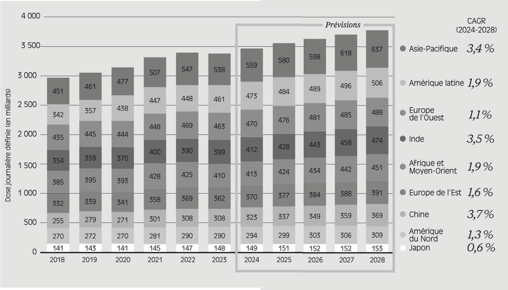 La croissance de la consommation de médicaments en Chine excédait en effet le rythme de 10 % par an à la fin des années 2000 et au début des années 2010*. Entre 2024 et 2028, la croissance de la demande en Chine et en Inde devrait continuer à dépasser largement celle de l’Europe et de l’Amérique du Nord, bien qu’elle connaisse un ralentissement marqué, avec un rythme annuel avoisinant 3,5 %.