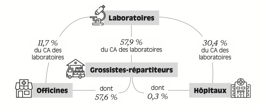 Lecture : 57,9 % du chiffre d’affaires (CA) des laboratoires s’effectuent via les grossistes-répartiteurs. Les grossistes répartiteurs approvisionnent très majoritairement les officines,et marginalement les hôpitaux.