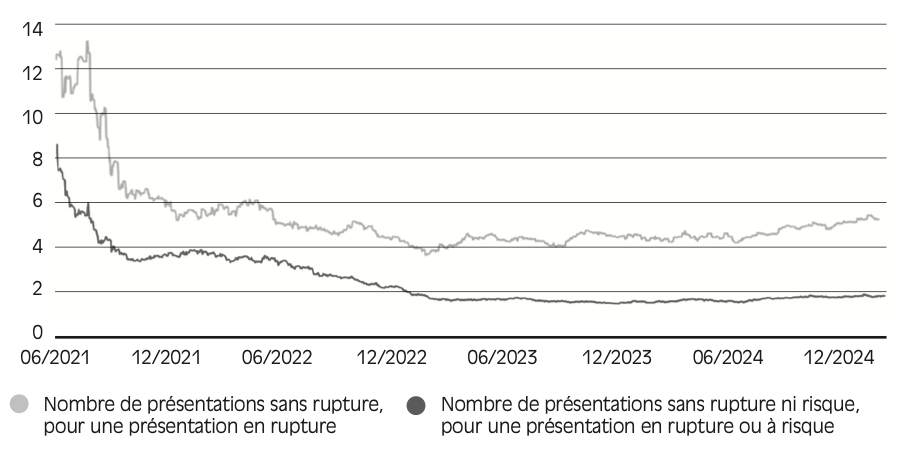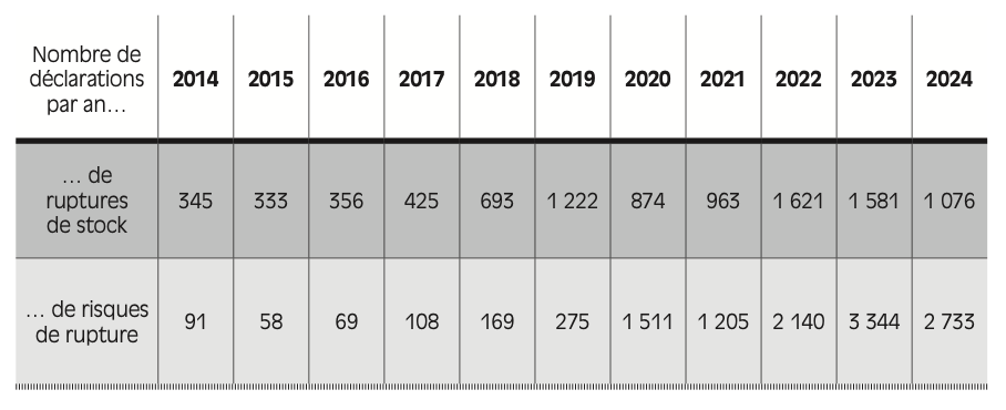 • 1 – Selon l’Agence nationale de sécurité du médicament (ANSM), le nombre de déclarations de pénurie de médicaments, qui comprennent à la fois les ruptures et les risques de rupture de stock, a été multiplié par près de neuf entre 2014 et 2024, avec une aggravation durable du phénomène à partir de 2019.