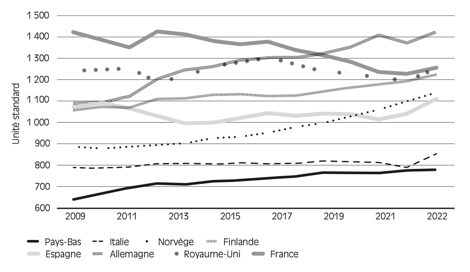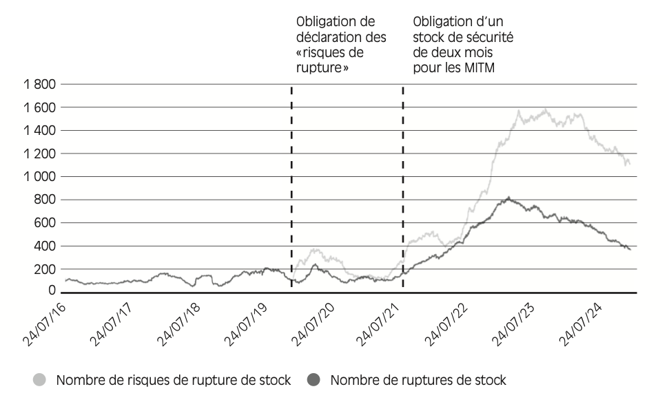 Les pénuries de produits de santé (médicaments et dispositifs médicaux) sont désormais un sujet majeur de santé publique. Selon les chiffres de l’Agence nationale de sécurité du médicament et des produits de santé (ANSM), le nombre de déclarations de rupture de stock de médicaments a triplé entre 2014 et 2023 en France2. Le nombre de tensions d’approvisionnement a en outre fortement augmenté durant cette période – avec une aggravation rapide de la situation entre 2019 et 20213. Cela n’est pas sans conséquence pour les patients : en 2023, 37 % des patients français ont été concernés par les pénuries de médicaments (de La Provôté et Cohen, 2023) et 45 % des personnes touchées ont dû modifier leur traitement ou y renoncer, avec parfois des conséquences dramatiques (France Assos Santé, 2023). Ce sujet n’est toutefois pas une spécificité française : l’ensemble des pays européens et les États-Unis y sont également confrontés (PGEU, 2024 ; Daniel McGeeney, 2025). Pour prévenir les pénuries, l’Union européenne (UE) a d’ailleurs créé en 2024 l’Alliance des médicaments critiques, chargée notamment de définir une politique industrielle pour améliorer la sécurité de l’approvisionnement, renforcer la disponibilité des médicaments et réduire les dépendances de la chaîne d’approvisionnement européenne.