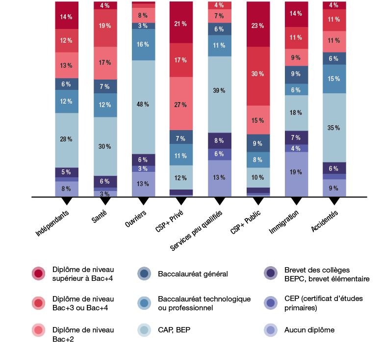 Les profils CSP+ Public et CSP+ Privé représentent respectivement 16,8 % et 18,5 % des répondants. D’autres ont un poids moins important parce qu’ils sont plus spécifiques, comme Immigration (6,2 %), Accidentés (7,8 %) ou Indépendants (9,2 %). Enfin, les profils Santé (12,9 %), Services peu qualifiés (14,9 %) et Ouvriers (13,6 %) complètent la répartition (figure 3).